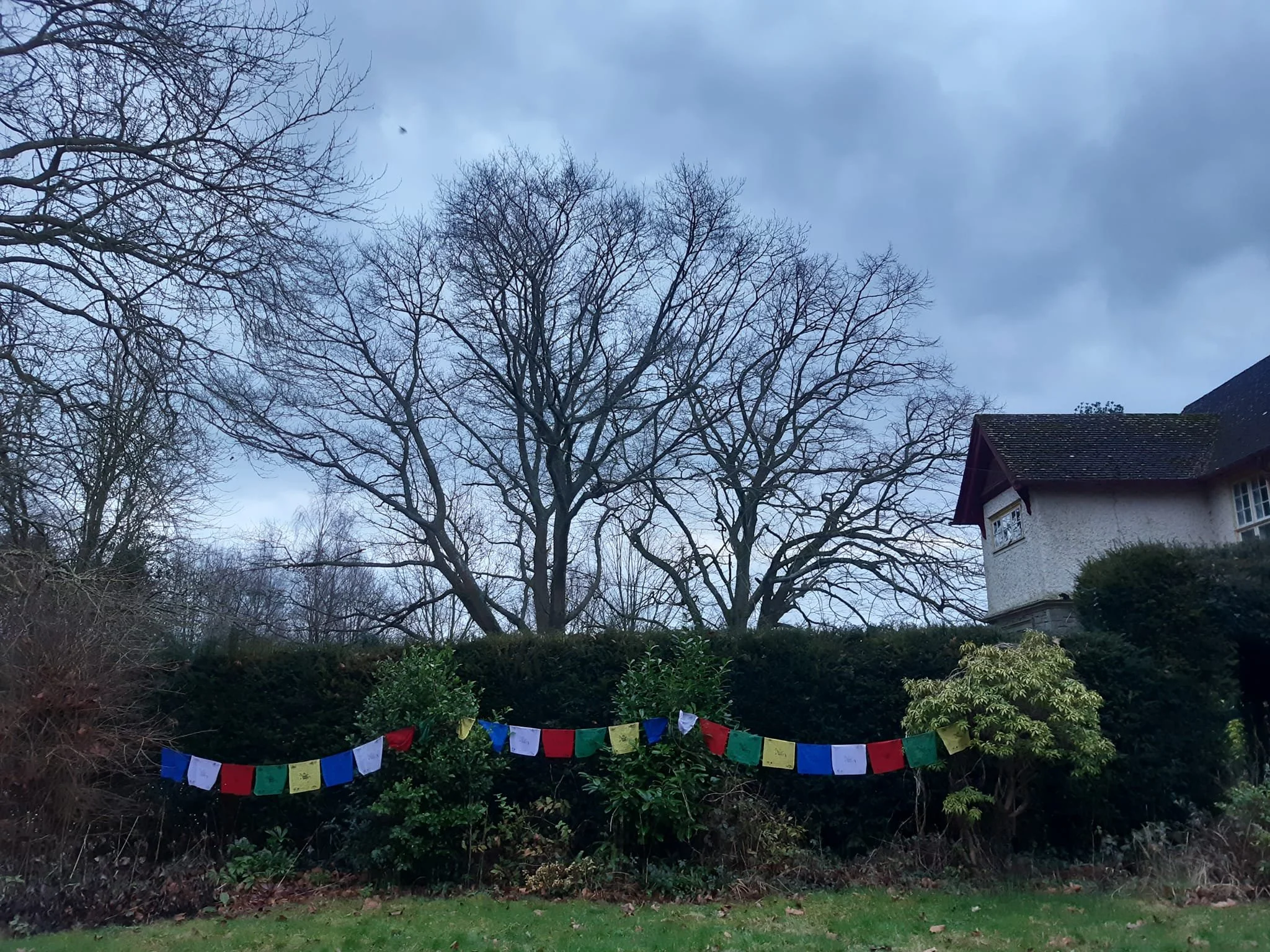 In groups of 2 or 3, equipped with string, scissors, ladders and flags, renew the Lam Rim grounds with colour and prayers